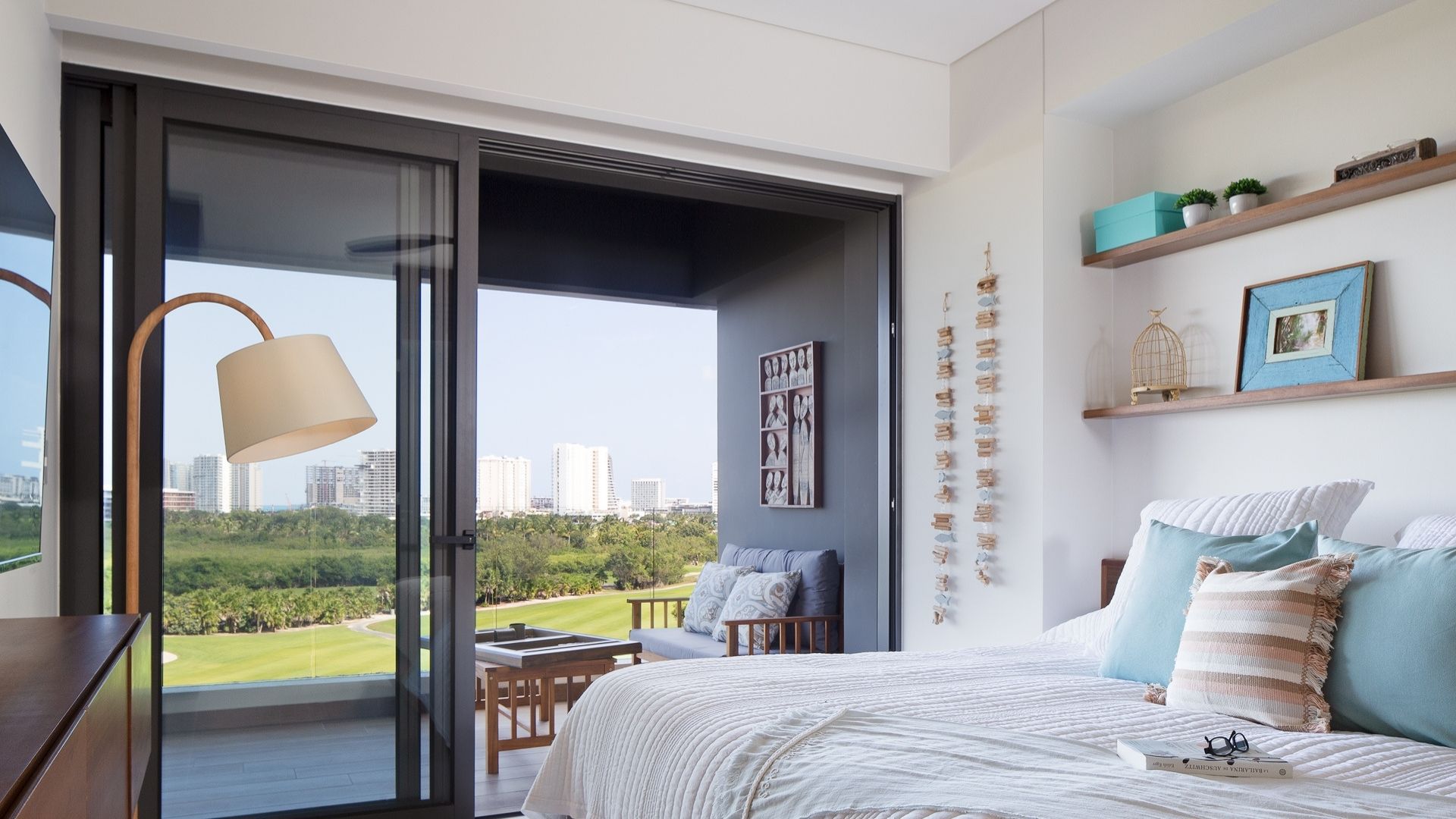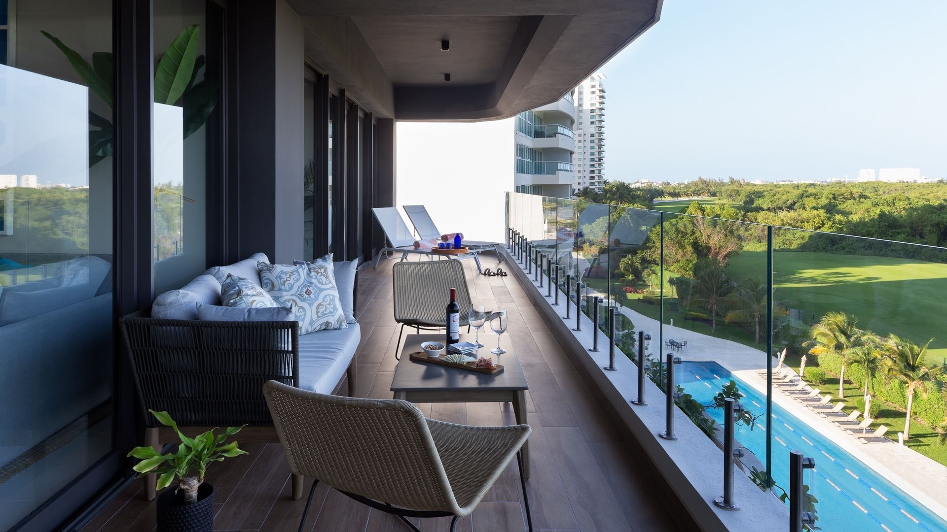 Terraza amplia con impresionantes vistas hacia la reserva natural, el campo de golf, Isla Mujeres y el Mar Caribe.